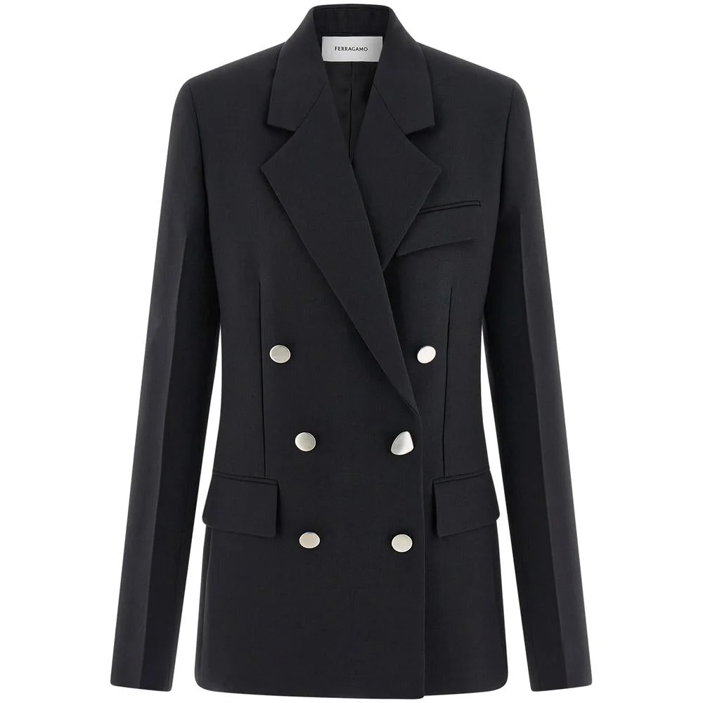 Black virgin wool double-breasted button fastening tailored cut decorative button detailing buttoned cuffs chest flap pocket two side flap pockets lined bodice Gender: Women Material: LINING COMPOSITION RAYON: 100.0%, OUTER COMPOSITION VIRGIN WOOL: 100.0% Color: Black Made in: IT Product ID: 13F723 0775741 NERO *Import tax/duty will be calculated at checkout (If applicable)
