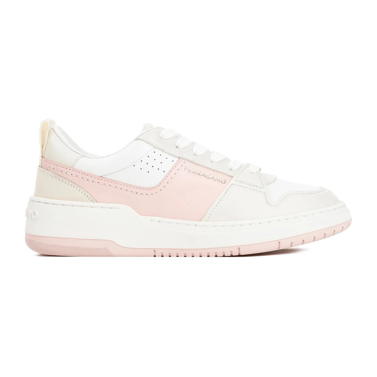 Ferragamo White and Pink Leather Dennis Sneakers. White and Pink Leather upper, lace-up fastening, round toeline, embossed logo on tongue, rubber sole. Gender: Women Material: 100%CALF LEATHER 100%RUBBER Color: Beige Made in: IT Product ID: 0769702_ *Import tax/duty will be calculated at checkout (If applicable)
