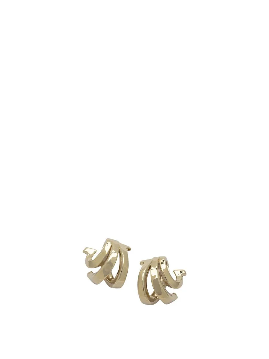 Ferragamo "Triplo Gancini" earrings, characterized by a compact hoop line. The structure features three Gancini elements, offered in a sloping sequence to give a progressive silhouette. The construction uses brass finished with light gold treatment. Pin closure system integrated into the back profile, designed to provide a secure hold. The surface shows uniform workmanship that enhances the clean lines of the shapes. || - Three element brass hooks, sloping size - Pin closure - Light gold surface finish Gender: Women Material: 100% BRASS Color: GOLD Made in: Italy Product ID: 0788161 *Import tax/duty will be calculated at checkout (If applicable)