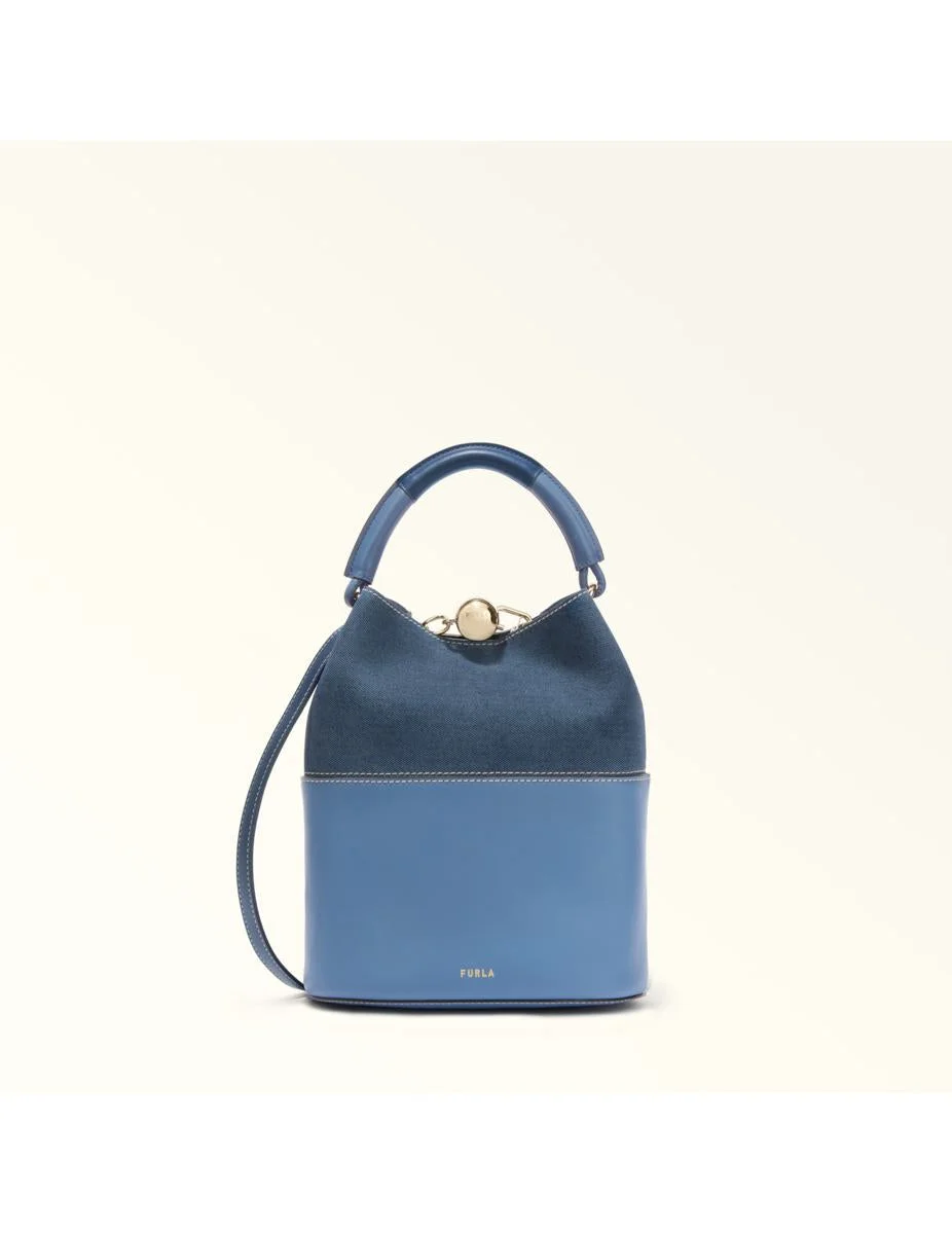 Leather Bucket Bag Jeans Color Compact and spacious, perfect for everyday use Made of denim-effect suede Fully unlined for a lightweight design Closure with the iconic Sfera hardware Matching adjustable and removable leather shoulder strap Magnet closure Furla logo printed on the front Dimensions: Width 22 cm Height 28.5 cm Depth 13 cm Gender: Women Material: 100% LEATHER Color: Blue Made in: Bulgaria Product ID: WB01867 BX3924 4083S *Import tax/duty will be calculated at checkout (If applicable)