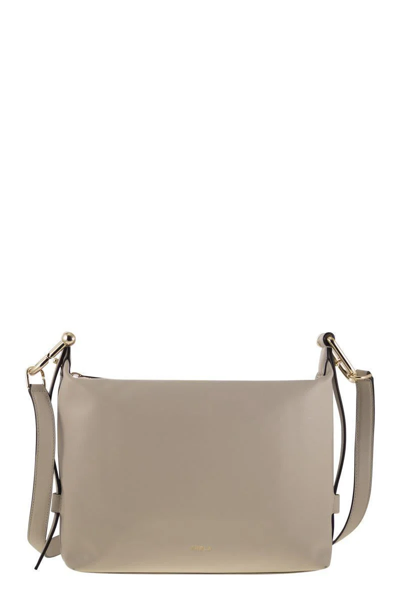 Clear, delicate geometric lines define the design of the Furla Nuvola hobo bag, a compact style crafted from soft leather with a grenade finish for a truly natural touch. The spacious interior is organised with a single open compartment suitable for holding all your essentials. The adjustable and removable handle is made distinctive by the new interpretation of the Arcosfera hardware, which combines the iconic Arco Furla logo with the brand's original round element. - Internal wall pocket with zip closure - Mushroom-shaped buttons on the sides to adjust the handle - Zip closure - Furla logo stamped on the back DESIGNER ID: WB01866 BX2045 VAN00 Measures: W 28 x H 21.5 x D 10 cm Gender: Women Material: OUTSIDE: 100% LEATHER INSIDE: 90% POLYESTER, 10% LEATHER Color: Grey Made in: Imported Product ID: WB01866 BX2045 VAN00 *Import tax/duty will be calculated at checkout (If applicable)