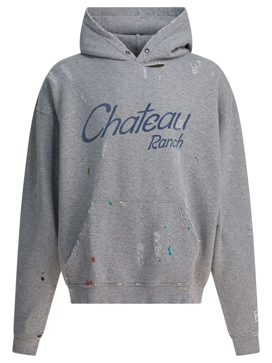 "Chateau Ranch" Gallery Dept. sweatshirt, 90s oversize construction, made of knitted fabric. The wide silhouette features an integrated hood, ribbed cuffs and hem. The "Chateau Ranch" logo is applied to the front, while graphic horseshoe inserts "Chateau Josue" are printed on both elbows. A front pocket completes the construction. Artisans manually decorate each piece, highlighting the "art on display" applique on the cuff. || - Front print and printed on the elbows - Long sleeves - Oversize fit - Front pocket - Applique on cuff - Hand-painted decoration Extra Description: GraphicsOversized fit;Long sleeves Gender: Men Material: 100% COTTON Color: GREY Made in: Imported Product ID: DCRH-50028HEATHER GREY *Import tax/duty will be calculated at checkout (If applicable)