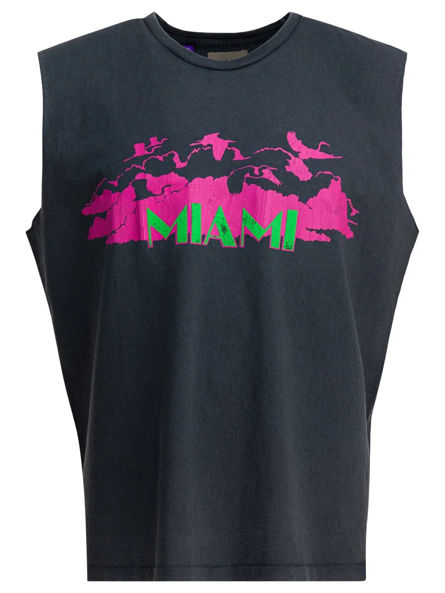 "Collins" Gallery Dept. tank top, made with a sleeveless, crew-neck construction. The silhouette features a soft, streamlined cut. On the front is applied a printed graphic with the words "Miami," while on the back is the Gd English logo with a glitter finish. The garment features an essential construction aimed at enhancing the prints as a distinctive element. || - "Miami" graphic print on the front - Gd English glitter logo on the back - Sleeveless - Crew neck - Soft cut - Relaxed fit Extra Description: GraphicsRelaxed fit;Sleeveless Gender: Men Material: 100% COTTON Color: GREY Made in: Imported Product ID: CST-10248OCEAN WASH BLACK *Import tax/duty will be calculated at checkout (If applicable)