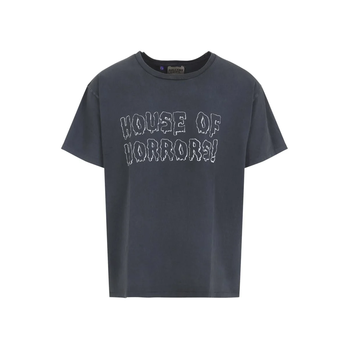 Gallery Dept. Horrors Black Cotton T-shirt. Crafted from vintage black cotton jersey, ribbed crewneck, "house of horrors!" print on the front, gold glitter logo on the back, straight hem, relaxed fit. Gender: Men Material: 100%COTTON Color: Black Made in: Imported Product ID: HT10053_ *Import tax/duty will be calculated at checkout (If applicable)
