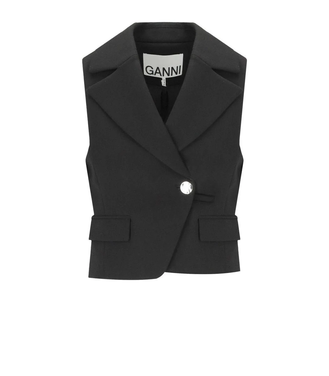 Ganni vest made of black crepe. Characterized by wide lapel neckline, it features a double-breasted closure with a silver metal logo button and an inner button. Distinguished by its cropped cut, it has double piped pockets on the front of the garment. Regular fit. Composition: 100% recycled polyester. Lining composition: 57% acetate, 43% viscose. Gender: Women Material: TECHNO Color: Black Made in: IMPORTED Product ID: W0243-099 *Import tax/duty will be calculated at checkout (If applicable)