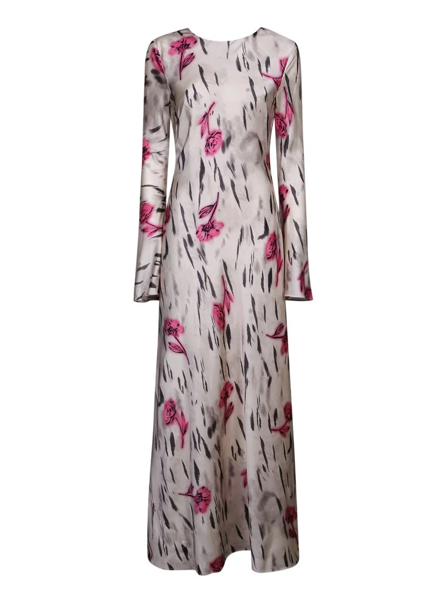Long sleeves. Satin fabric. Pink floral print on an ivory background. Timeless elegance meets modern freshness in this GANNI maxi dress, crafted in soft satin and adorned with a delicate floral print. The flowing design and elongated silhouette enhance the figure with grace and femininity. Gender: Women Material: 96% VISCOSE 4% ELASTANE Color: WHITE Made in: Imported Product ID: W0460 135 *Import tax/duty will be calculated at checkout (If applicable)