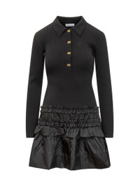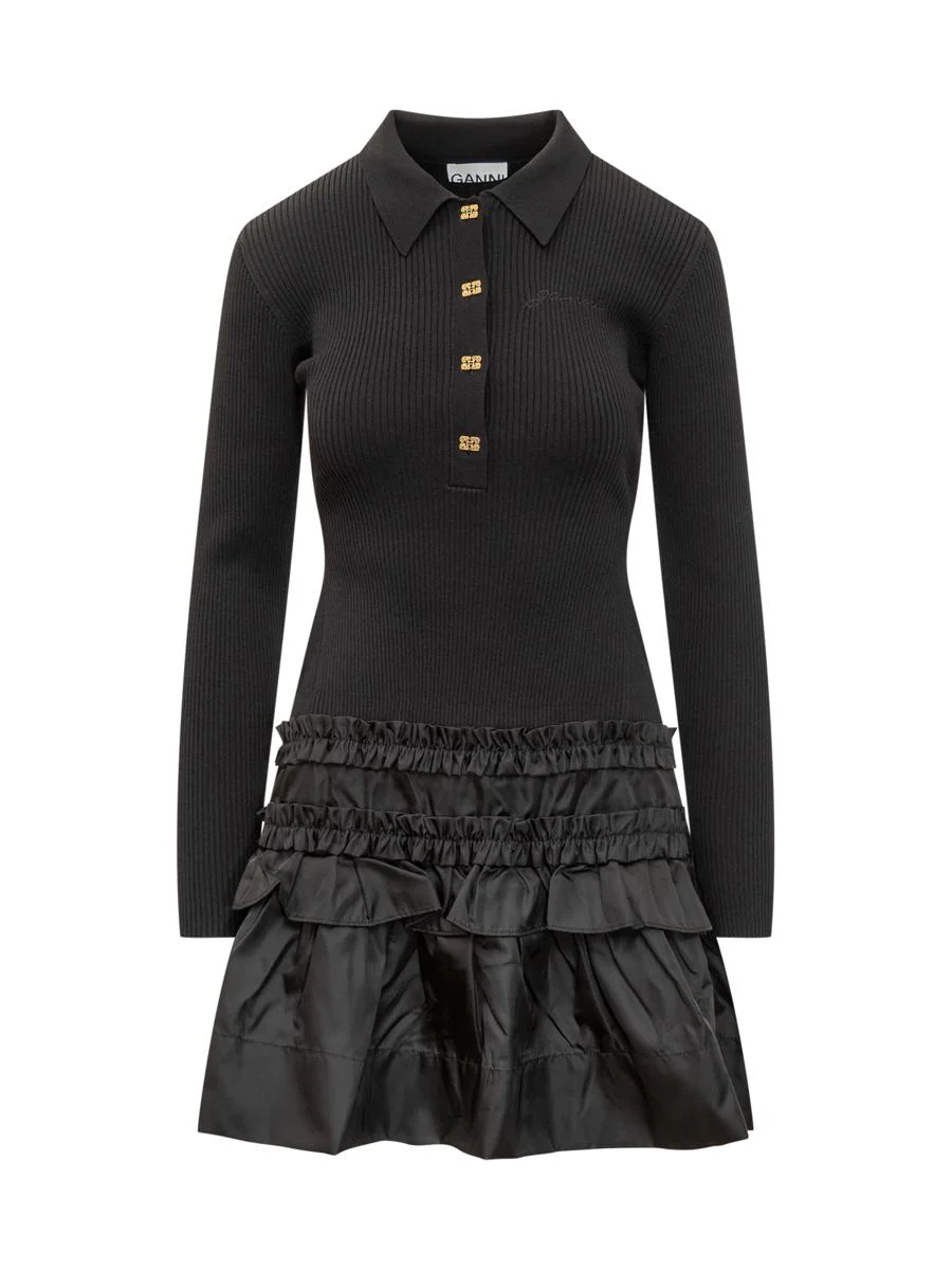 Black knit Ganni mini dress with long sleeves, polo collar and gold buttons. Gender: Women Material: 53% VISCOSE, 31% NYLON, 14% POLYAMIDE, 2% ELASTANE - 93% NYLON, 7% POLYURETHANE Color: Black Made in: Imported Product ID: K2523 099 *Import tax/duty will be calculated at checkout (If applicable)