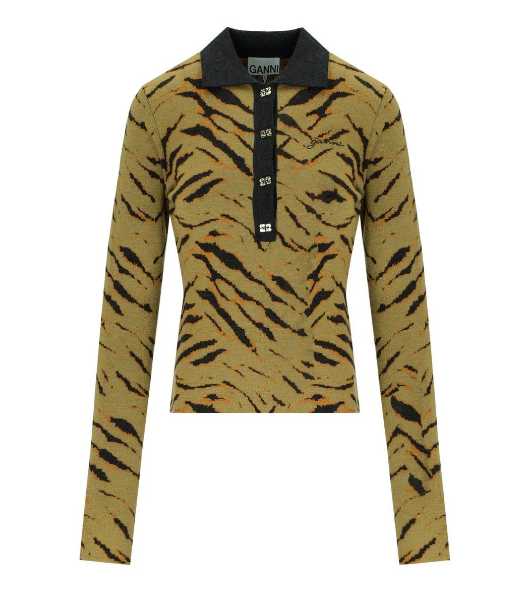 Ganni jumper made from merino wool in a khaki shade with a zebra pattern. Featuring a polo collar in grey tones and a button closure with branded buttons. Embroidered Ganni logo on the front. Slim fit. Composition: 100% merino wool. Gender: Women Material: WOOL Color: Beige Made in: Imported Product ID: K2600-999 *Import tax/duty will be calculated at checkout (If applicable)