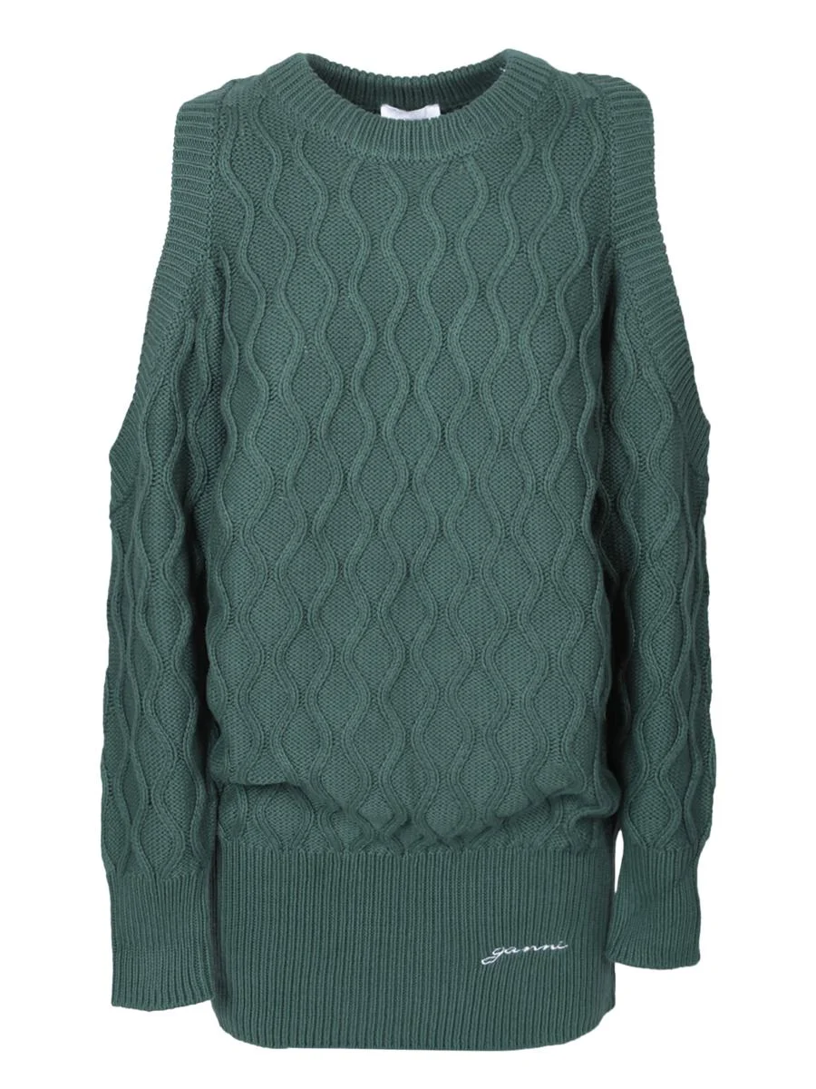 Ganni puts an irreverent twist on the classic jumper dress by adding exaggerated cold shoulder cut-outs along the arms Round neck. Knitted construction. Ribbed trim. Embroidered logo to the front. Cut-out detail. Color: green Material: 100% Organic Cotton Gender: WOMEN Material: 100% ORGANIC COTTON Color: GREEN Product ID: K1921 519 *Import tax/duty will be calculated at checkout (If applicable)