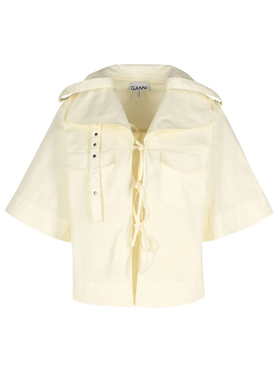 Wide collar, deep V-neck, adjustable short sleeves, three-lace closure, button details on the shoulders, belt detail on the collar, two front pockets Gender: Women Material: 97% cotton, 3% elastane Color: Beige Made in: Imported Product ID: W0690135 *Import tax/duty will be calculated at checkout (If applicable)