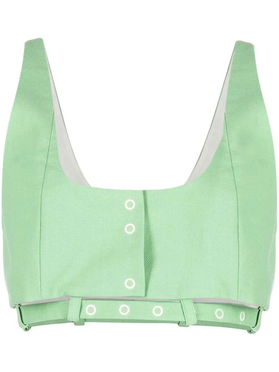 Suiting crop top from GANNI featuring light green, organic cotton, round neck, sleeveless, front press-stud fastening, cut-out detailing, belted waist and cropped. Conscious: This item is made from at least 50% organic materials. This piece fits true to size. We recommend you get your regular size Model is 1,75m / 5ft 8in wearing size 36 (FR) Gender: Women Material: LINING: VISCOSE 100% ORGANIC COTTON 100% Color: VERDE ACQUA Made in: PT Product ID: F7596484 *Import tax/duty will be calculated at checkout (If applicable)