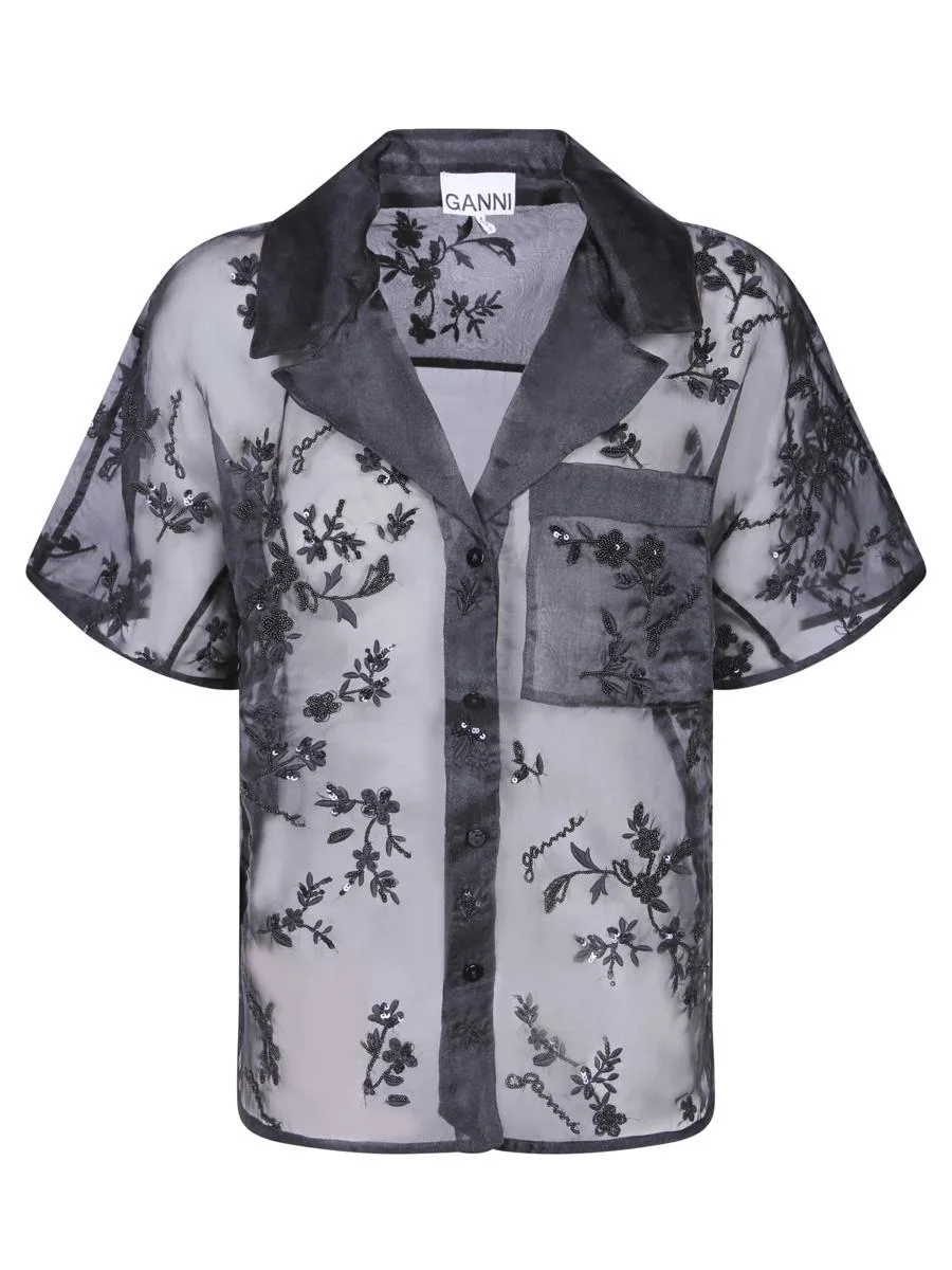 Transparent organza shirt with silver sequin embroidery. Short sleeves and pointed collar. Chest patch pocket. This elegant GANNI shirt features a transparent organza design embellished with delicate floral sequin embroidery that gracefully catches the light. A refined choice for formal evenings or as a sophisticated overlay for distinctive daytime outfits. Gender: Women Material: 100% RECYCLED POLYESTER Color: Black Made in: Imported Product ID: W0646 099 *Import tax/duty will be calculated at checkout (If applicable)