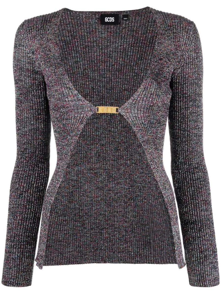 glittered V-neck cardigan from GCDS featuring dark grey, knitted construction, glitter detailing, V-neck, clasp fastening, long sleeves and straight hem. This piece fits true to size. We recommend you get your regular size Model is 1,75m / 5ft 8in wearing size S Gender: Women Material: VISCOSE 70%, POLYESTER 15%, METAL 15% Color: GREY Made in: IT Product ID: SS23W370907MX *Import tax/duty will be calculated at checkout (If applicable)