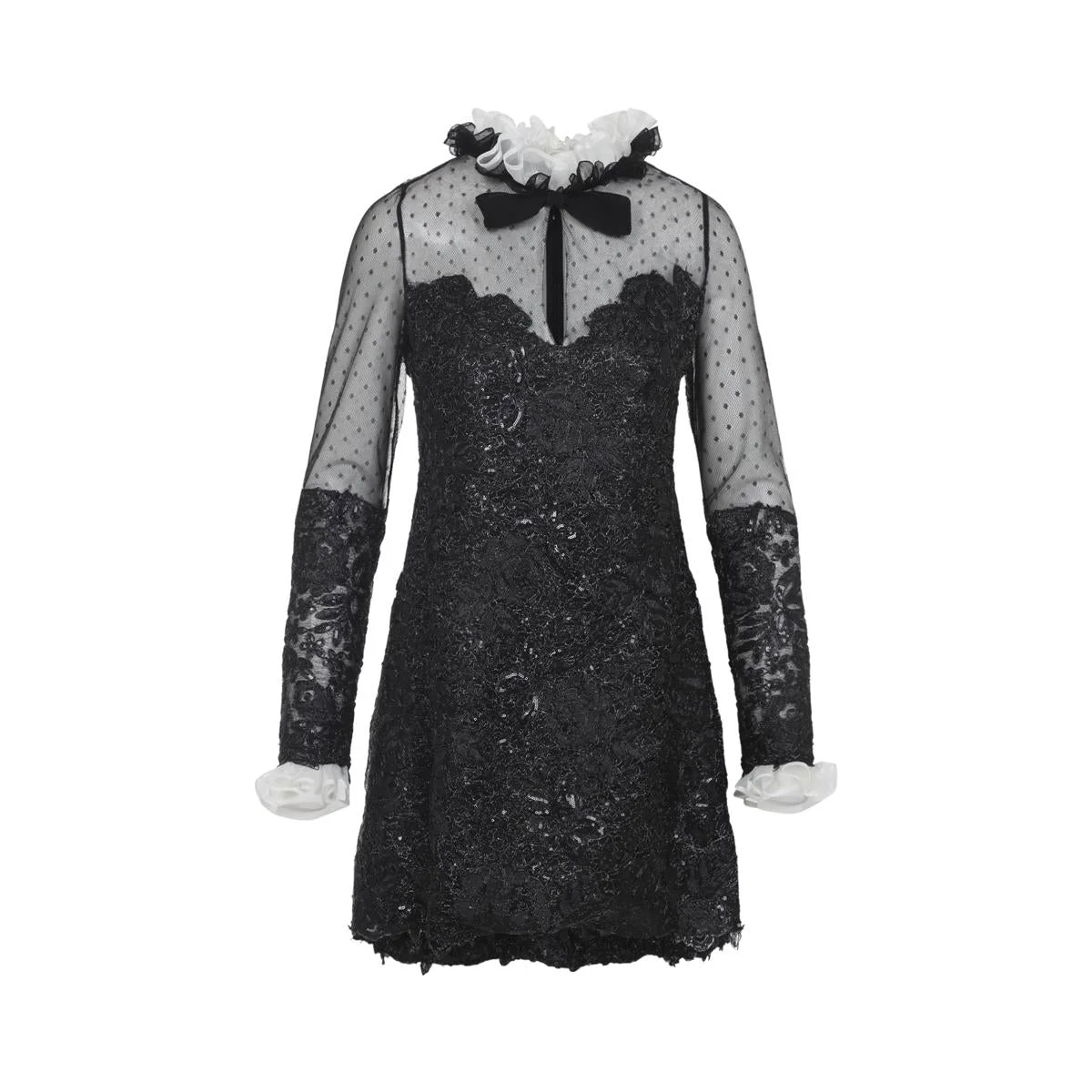 Giambattista Valli Black Mini Dress. Crafted in polyester, polyamide and silk. Ruffled black and white collar, front tonal bow detail, sweetheart lace corset design, back zipped fastening, long sleeves, lace design on the cuffs, contrasting white ruffled cuffs, mini-length, straight hem. Transparent details with tonal polka dot pattern. Gender: Women Material: 100%POLYESTER 100%POLYAMIDE 100%SILK Color: Black Made in: Italy Product ID: 25FWSVTE5007.84BIS_9999 *Import tax/duty will be calculated at checkout (If applicable)