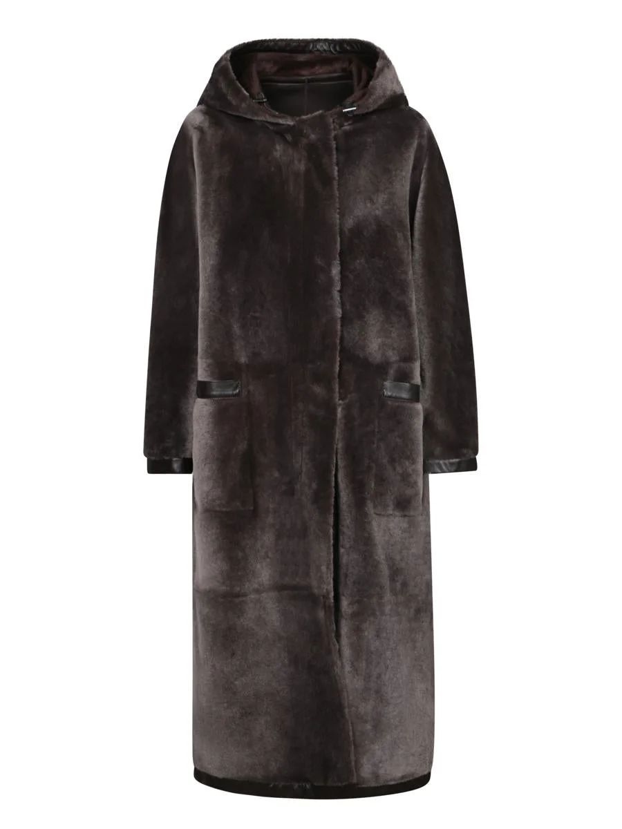 Wool coat with hood, patch pockets, and leather details. Front closure with hidden buttons.. Unmistakable elegance by Giorgio Armani, this reversible lamb wool coat features an exclusive coffee hue. Meticulously finished interiors and a versatile look for winter Gender: Women Material: MADE IN ITALY Color: BROWN Made in: Imported Product ID: GW002049 AF19599 U6300 *Import tax/duty will be calculated at checkout (If applicable)