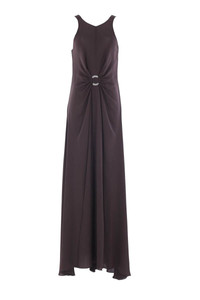 Giorgio Armani sleeveless long dress crafted from dark brown silk georgette. Featuring a V-neckline on both sides, invisible back zip closure, front ruching detail with metal ring, slightly train-like hem, and unlined interior. Gender: Women Material: 100% SILK Color: Brown Made in: Italy Product ID: GW002301TE10814U8130 *Import tax/duty will be calculated at checkout (If applicable)