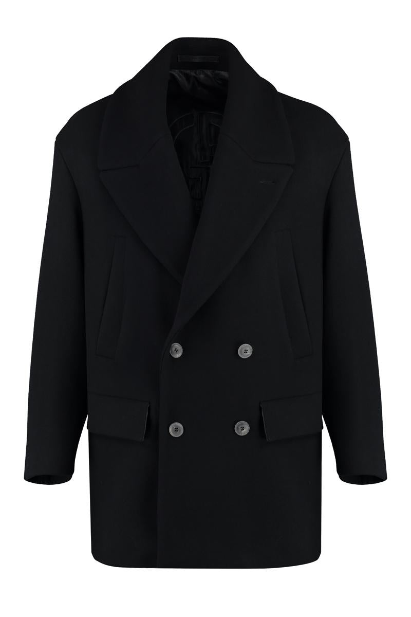 Wool blend double-breasted coat Lapel collar Two hand warmer pockets Two buttoned front flap pockets Extendable side zippers 23% Polyamide, 5% Cashmere, 68% Virgin wool, 4% Elastane Gender: Men Material: VIRGIN WOOL Color: Black Made in: IT Product ID: 3WGOC0ACT0200_UC99 *Import tax/duty will be calculated at checkout (If applicable)