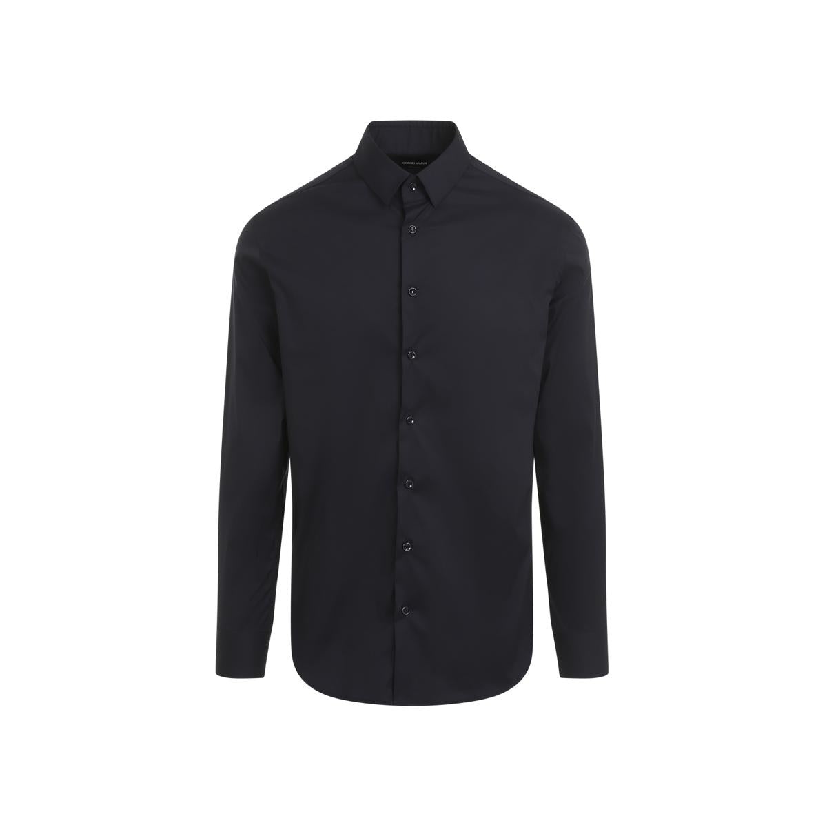 Giorgio Armani Dark Navy-Blue Cotton Shirt. Crafted in cotton and polyester blend. Pointed collar, front buttoned fastening, long sleeves, buttoned cuffs, round hem. Gender: Men Material: 75%COTTON 21%POLYAMIDE 4%ELASTANE Color: BLUE Made in: IT Product ID: GM000056.TE11184_109 *Import tax/duty will be calculated at checkout (If applicable)