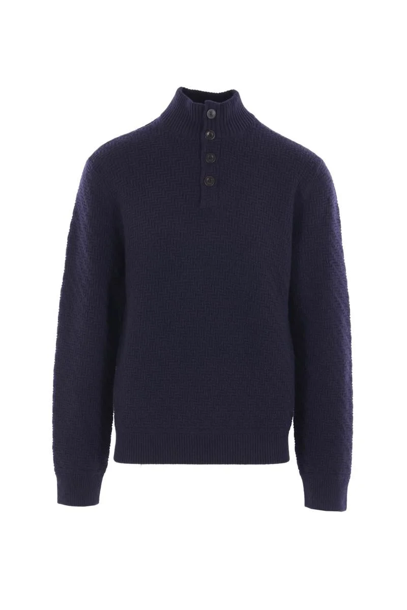 Giorgio Armani sweater made of dark blue cashmere knit with a geometric pattern. Featuring a high neck, partial button closure, long sleeves, ribbed edges, and a straight hem. Gender: Men Material: 100% CASHMERE Color: BLUE Made in: Italy Product ID: GM001961AF19073UB101 *Import tax/duty will be calculated at checkout (If applicable)
