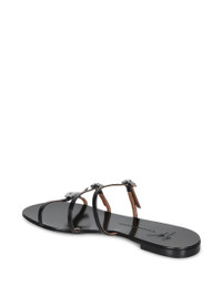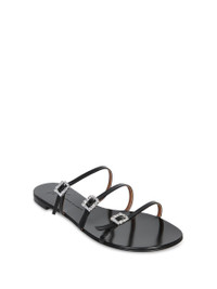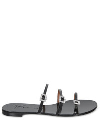 Black leather flat sandals with jewel detail on the strap. An expression of pure elegance, these Giuseppe Zanotti sandals are defined by sparkling gems set on slim black straps. The minimalist silhouette pairs perfectly with the bold shimmer of the decorations, making these shoes ideal for sophisticated summer ev Gender: Women Material: 100% CALF LEATHER Color: Black Made in: Imported Product ID: E500010 002 *Import tax/duty will be calculated at checkout (If applicable)