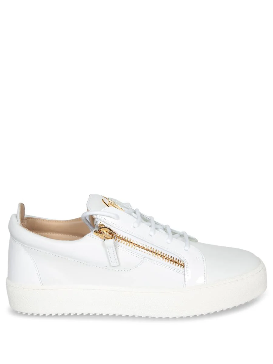Smooth leather sneakers with side gold zipper and metallic logo detail. Rubber sole. An urban-chic style icon, Giuseppe Zanotti's 'Frankie Zip' sneakers enhance any look with a touch of understated luxury. Perfect for a sophisticated stride, from morning to evening. Gender: Men Material: 100% LEATHER Color: WHITE Made in: Imported Product ID: RU50000 004 *Import tax/duty will be calculated at checkout (If applicable)