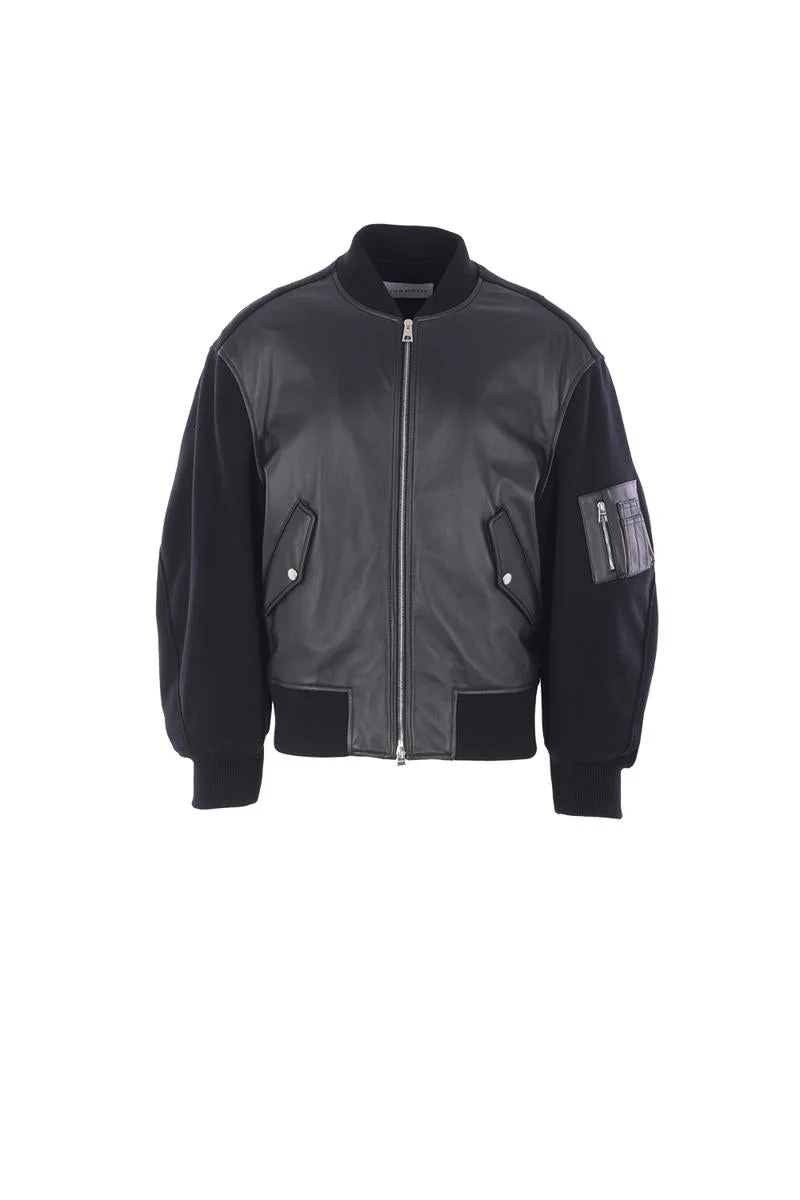 Givenchy lightly padded bomber jacket crafted from black wool knit with a front nappa leather panel. Featuring a bomber collar, two-way zip front closure, multiple pockets, long sleeves, and ribbed knit trims. Fully lined interior. The design is completed with a logo patch on the back. Gender: Men Material: 100 % LAMB LEATHER Color: Black Made in: Italy Product ID: BM01DF4YND001 *Import tax/duty will be calculated at checkout (If applicable)