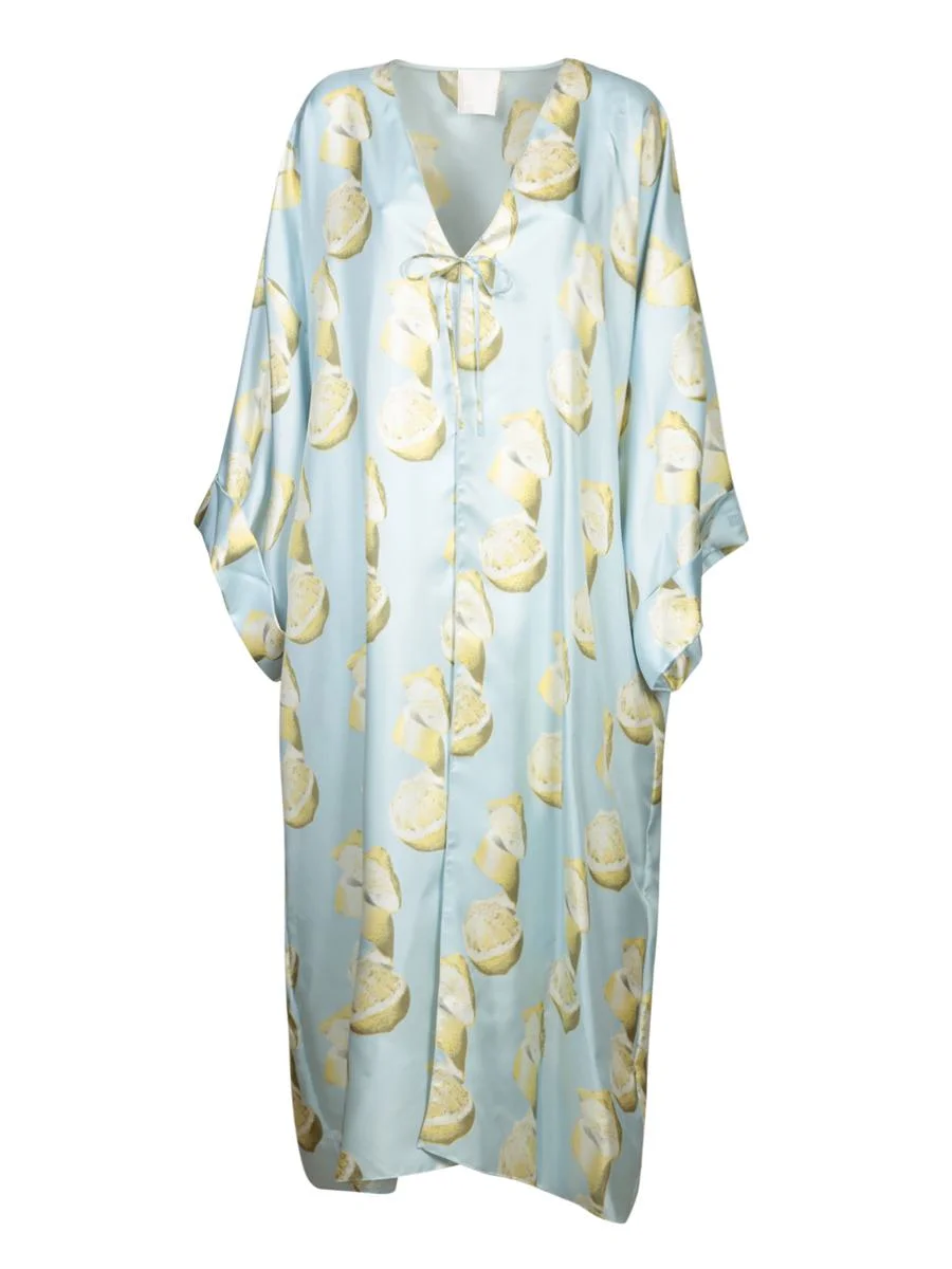 Long silk kaftan with lemon print. V-neck with decorative laces. Wide kimono-style sleeves.. This elegant Givenchy kaftan captures the essence of summer with its vibrant lemon print on light silk, enhanced by a delicate front lacing and fluttering sleeves that add a touch of grace. Gender: Women Material: 100% SILK Color: BLUE Made in: Imported Product ID: BW619Y1 5MX 969 *Import tax/duty will be calculated at checkout (If applicable)