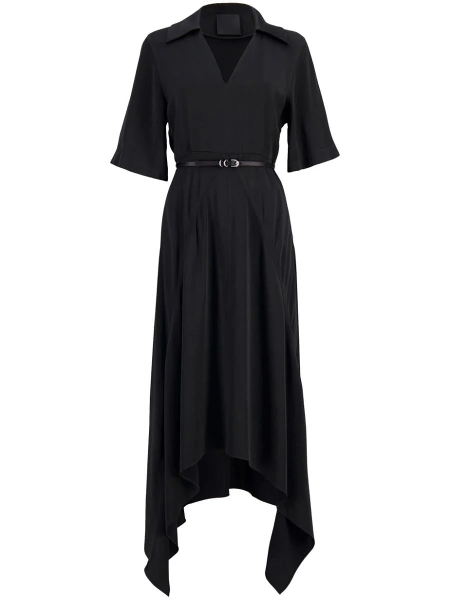 jet black satin weave detachable and adjustable waist belt classic collar V-neck concealed rear zip fastening short sleeves asymmetric hem Gender: Women Material: VISCOSE 39% ACETATE 61% Color: Black Made in: IT Product ID: BW223R14N6 001 *Import tax/duty will be calculated at checkout (If applicable)