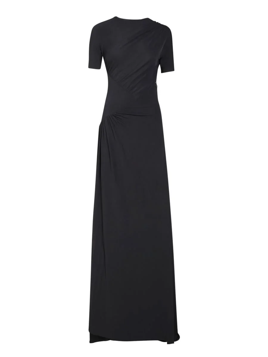 Long dress by Givenchy Roundneck. Short sleeves. Gender: Women Material: 85% VISCOSE 12% POLYAMIDE 3% ELASTANE Color: Black Made in: Imported Product ID: BW21MQ 30XK 001 *Import tax/duty will be calculated at checkout (If applicable)