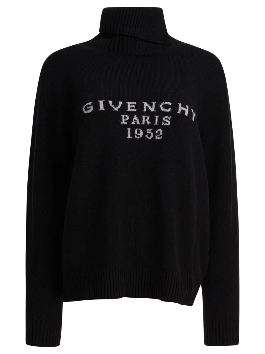Givenchy Paris 1952" Givenchy turtleneck sweater, made from a blend of wool and cashmere, features a compact structure with a straight silhouette. The high collar, along with ribbed hem and cuffs, provides stability and definition to the architecture of the garment. The surface maintains a uniform texture, with the Givenchy Paris 1952 text insert placed frontally on the knit. || - Front logo - Long sleeves - Ribbed collar - Ribbed hem - Ribbed cuffs - Wool and cashmere - Regular fit Extra Description: LogoRegular fit;Long sleeves Gender: Women Material: 70% WOOL 30% CASHMERE Color: Black Made in: Italy Product ID: BW90VE4ZSN001 *Import tax/duty will be calculated at checkout (If applicable)