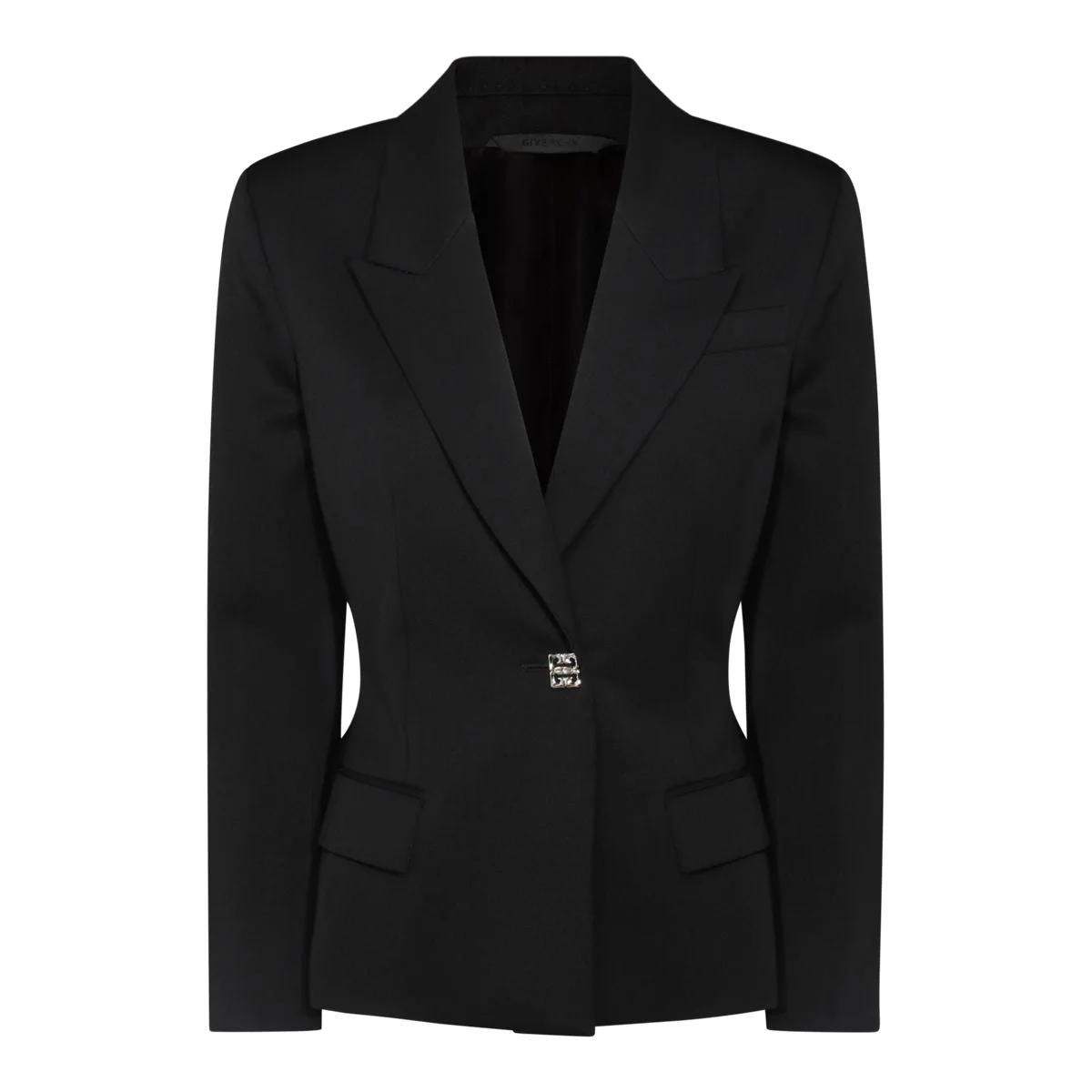 Givenchy Structured Black Virgin Wool Jacket. Crafted from black virgin wool, peak lapels, reinforced shoulders, slit pocket on the breast, two front flap pockets, covered button at cuffs, single-breasted with logo-shaped button closure, fitted waist for an hourglass silhouette, lined. Gender: Women Material: 100%VIRGIN WOOL Color: Black Made in: IT Product ID: BW30JM15CT_001 *Import tax/duty will be calculated at checkout (If applicable)