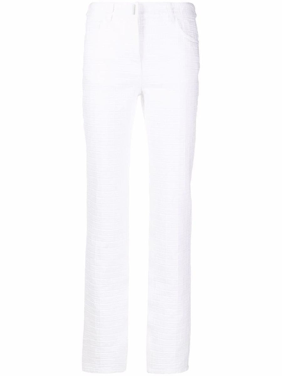 White cotton denim 4G motif jacquard straight-leg trousers from GIVENCHY featuring signature 4G motif, logo plaque, full jacquard, concealed front fastening, slip pockets to the sides and two rear jetted pockets. Model is 1,75m / 5ft 8in wearing size 27 (WAIST CM) Gender: Women Material: MAIN MATERIAL : 100 % COTTON Color: WHITE Made in: IT Product ID: BW50Q550PS100 *Import tax/duty will be calculated at checkout (If applicable)