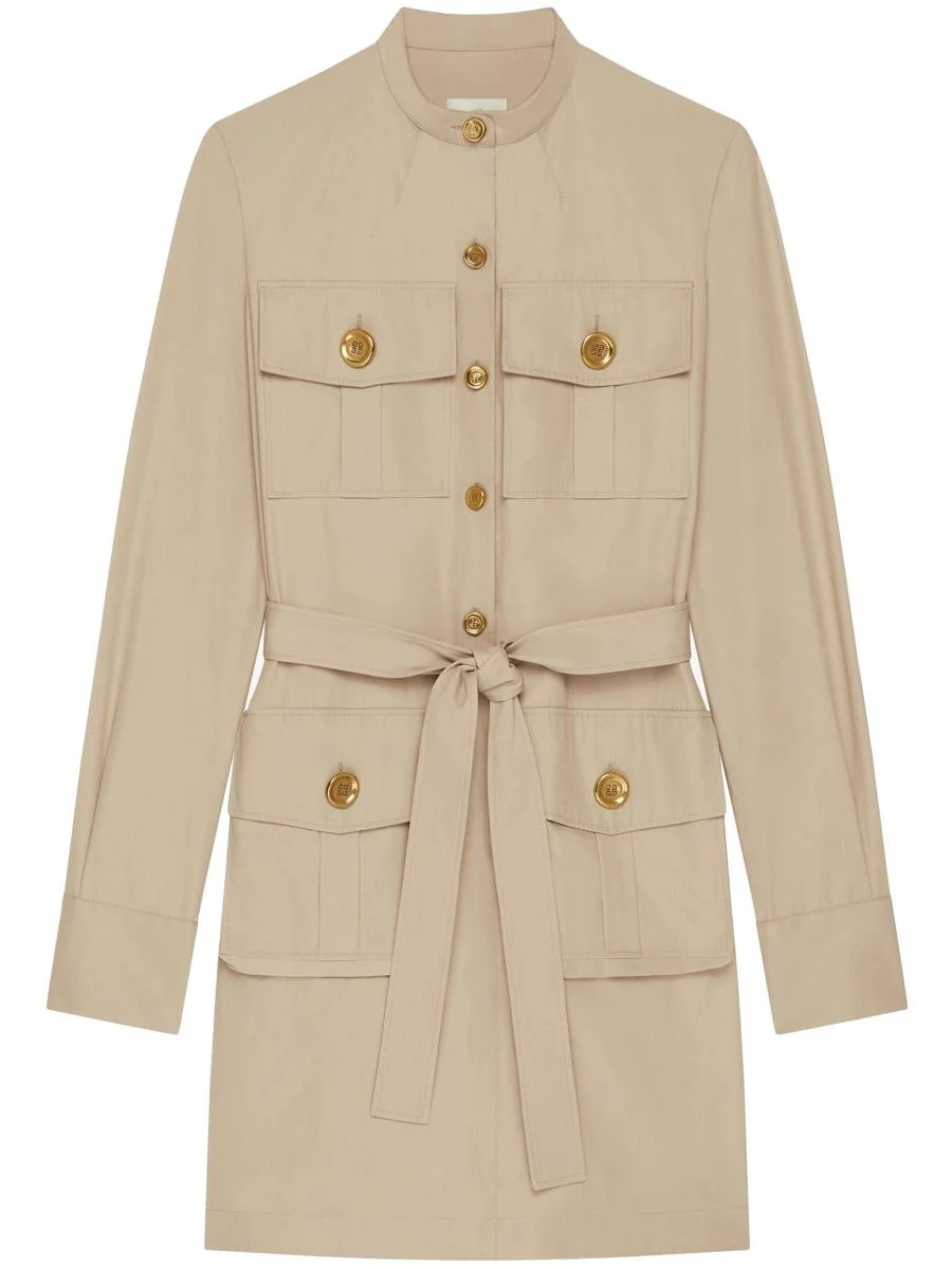 Short cotton poplin dress with long sleeves and mandarin collar. Features a removable belt, 4G logo gold button closure and four flap pockets on the front. Perfect for a sophisticated and practical look. Gender: Women Material: COTTONTTON | 100% COTTON Color: Beige Made in: IT Product ID: BW22A915VK_281 TAUPE *Import tax/duty will be calculated at checkout (If applicable)