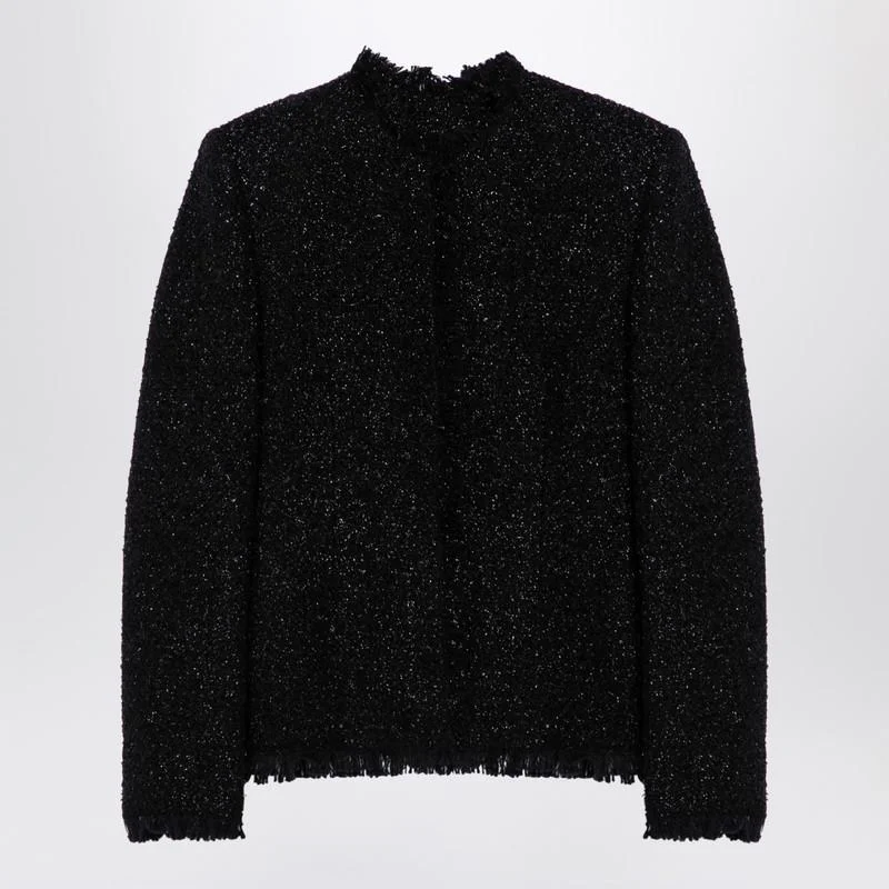 Black wool-blend tweed crewneck jacket with lurex by Givenchy, features long sleeves, front hooks and frayed edges. Gender: Women Material: Fabric I: 36% Wool - 34% Cotton - 30% Polyamide / Lining: 100% Cupro Color: Black Made in: IT Product ID: BW30JJ15MD/P_GIV-001 *Import tax/duty will be calculated at checkout (If applicable)