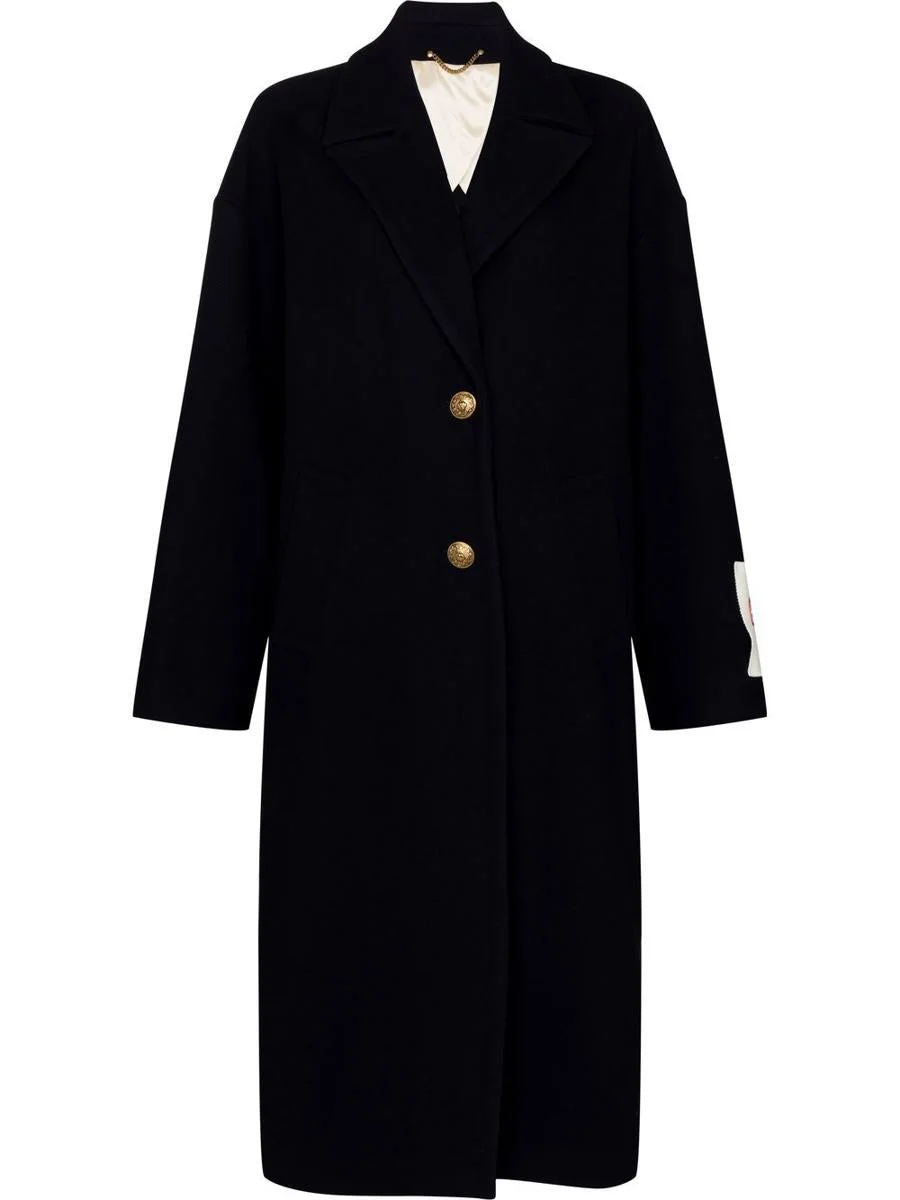 Women's single-breasted cocoon coat in dark blue wool with gold button