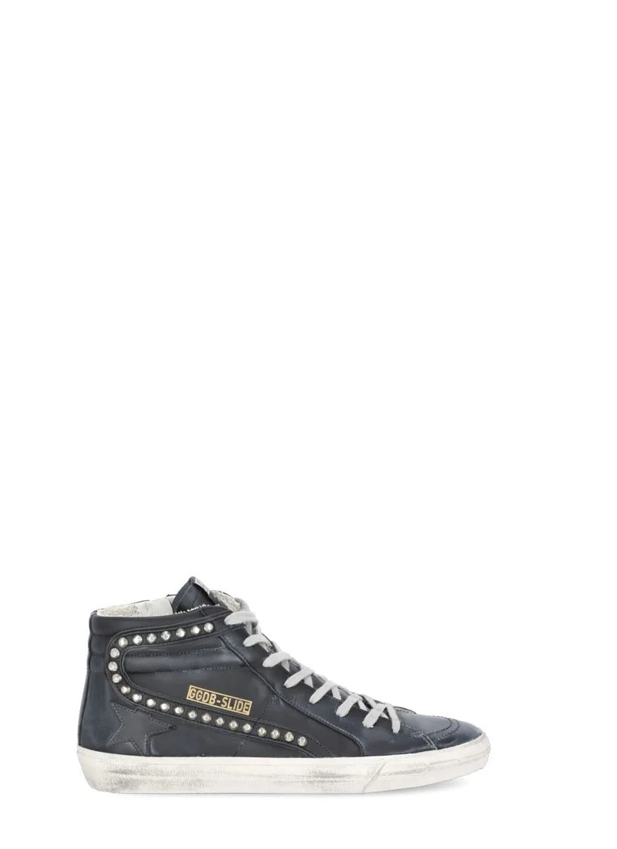 - Black Golden Goose smooth leather sneakers for woman - Round toe - Front contrasting color laces fastening - All over metal studs details - Logoed Golden Goose tab at tongue - Side zip fastening - Side golden Golden Goose logo - Rubber sole Shoe runs true size Gender: Women Material: 100% COW LEATHER INTERIOR: 66% COW LEATHER 34% COTTON SOLE: 100% RUBBER Color: BLACK Made in: IT Product ID: GWF00115.F000323.90100SLIDE LEATHER *Import tax/duty will be calculated at checkout (If applicable)