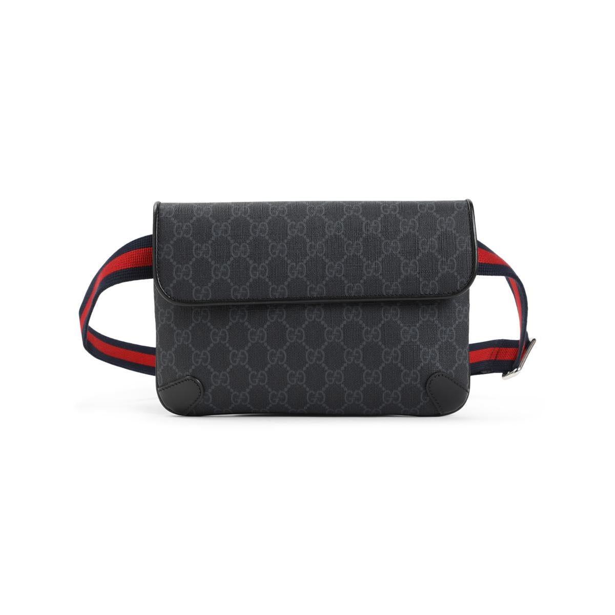 Gucci Black GG Textile Belt Bag. Crafted from black GG supreme canvas, black leather piping and details, adjustable Red and Blue Web shoulder strap, concealed magnetic button fastening, lined. Measures: W:24cm H:16,5cm D:6cm Gender: Men Material: 100%TEXTILE GG SUPREME 100%LEATHER 100%COTTON Color: Black Made in: IT Product ID: 792091.FADJA_1042 *Import tax/duty will be calculated at checkout (If applicable)