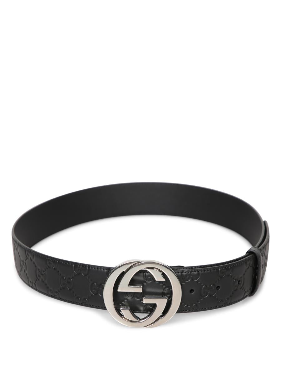 Leather belt with GG monogram texture. Metal buckle with Gucci logo.. The Gucci Signature Black Belt stands out for its elegant and sophisticated design, featuring an embossed texture that echoes the house's iconic monogram and a polished metal buckle for a touch of luxury Gender: Men Material: 100% CALF LEATHER Color: Black Made in: Imported Product ID: 411924 CWC1N 1000 *Import tax/duty will be calculated at checkout (If applicable)