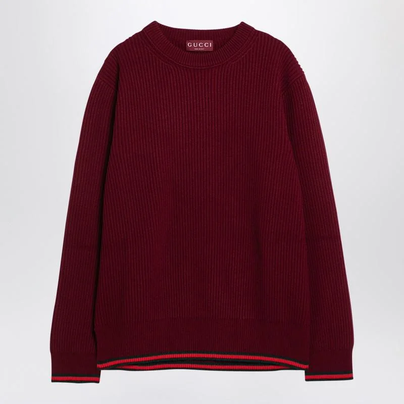 Burgundy wool and cashmere crew-neck jumper from Gucci featuring long sleeves, a ribbed design, red/green/red web ribbon cuffs and hem, and side slits. Gender: Men Material: 70% Wool - 30% Cashmere Color: Red Made in: Italy Product ID: 801692XKD96/P_GUC-6232 *Import tax/duty will be calculated at checkout (If applicable)