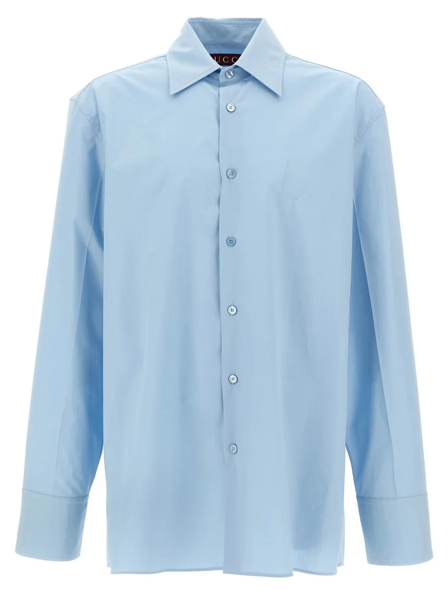 Cotton poplin shirt with embossed front logo, button closure, long cuffed sleeves and dropped shoulders Gender: Men Material: 100% COTTON Color: BLUE Made in: Italy Product ID: 823830Z7AMD4030 *Import tax/duty will be calculated at checkout (If applicable)