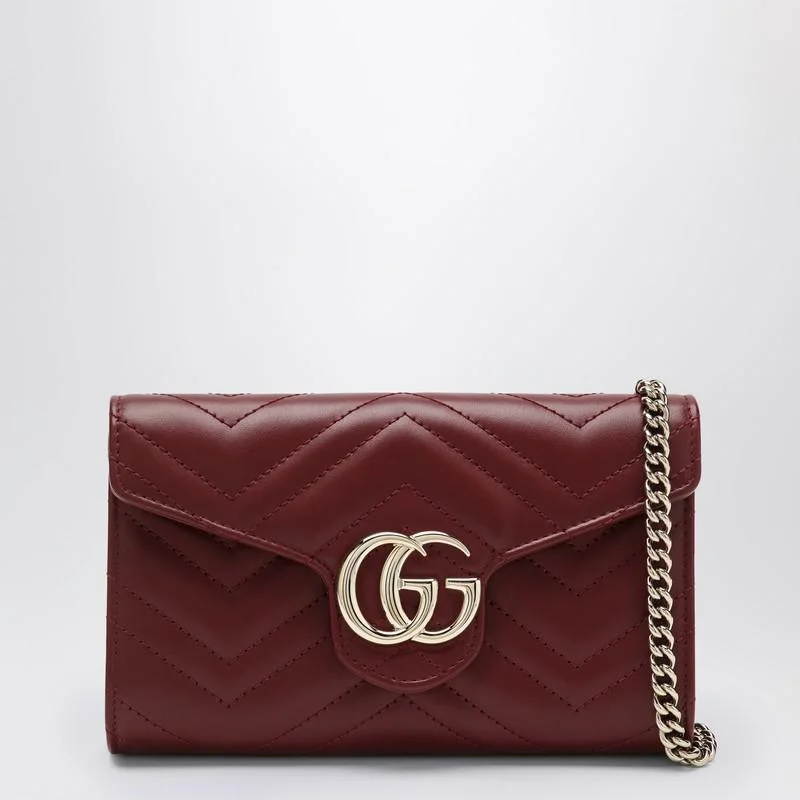 Gucci wallet in red matelasse leather with chevron pattern, featuring a chain shoulder strap, front flap with magnetic closure, Double G on the front, six card slots, one zip pocket, and one flap pocket. Gender: Women Material: 100% Leather Color: Red Made in: Italy Product ID: 837745AAET8/R_GUC-6207 *Import tax/duty will be calculated at checkout (If applicable)
