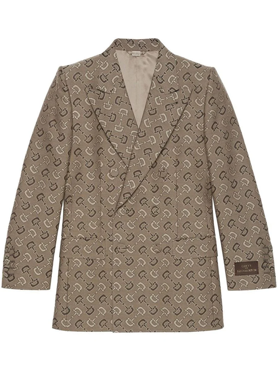Gucci’s double-breasted jacket crafted in beige / brown cotton and wool with Maxi Horsebit motif. Featuring peak lapel, front covered button closure, structured shoulders, long sleeves with buttoned cuffs, front pockets and back central vent. The design is completed by the Gucci Metamorfosi label patch at left cuff. Lined interior. Gender: Men Material: T COTTON70%T WOOL30%F1 VISCOSE 100%FM CUPRO 100%FP COTTON 100% Color: BEIGE+BROWN Made in: IT Product ID: 705284ZAKIV9549 *Import tax/duty will be calculated at checkout (If applicable)