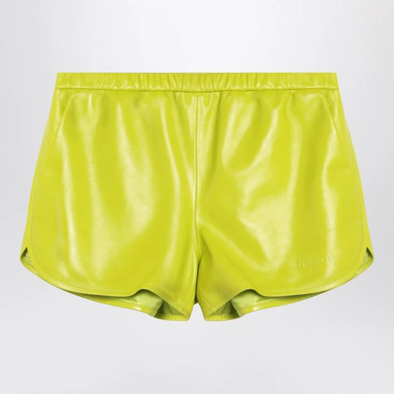 Shorts by Gucci in lime green lambskin, featuring an elasticated waist, two side welt pockets, rounded edges, and a tone-on-tone embossed logo on the front. Gender: Women Material: Fabric I: 100% Lambskin / Lining: 100% Viscose Color: GREEN Made in: Italy Product ID: 833131XNA68/Q_GUC-3753 *Import tax/duty will be calculated at checkout (If applicable)