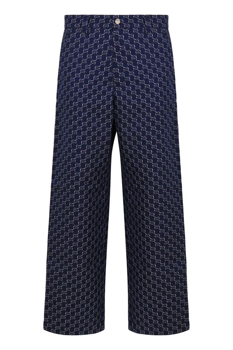 GUCCI'S BUTTON-AND-ZIP FRONT CLOSURE PANTS HAVE A SLEEK AND VERSATILE FIT, SUITABLE FOR BOTH FORMAL AND CASUAL LOOKS. THE WAISTBAND WITH BELT LOOPS ADDS A PERSONALIZED TOUCH, WHILE THE SIDE WELT POCKETS AND BACK PATCH POCKETS ARE PRACTICAL YET DISCREET. THE APPLIED GG LOGO ON THE BACK AND THE GG PATTERN LEND AN ICONIC TOUCH, MAKING THEM INSTANTLY RECOGNIZABLE AS PART OF THE HIGH FASHION HOUSE. A GARMENT THAT COMBINES LUXURY, QUALITY AND TIMELESS STYLE. RTW IT Gender: Men Material: COTTON Color: BLUE Made in: IT Product ID: 814727ZAR26_4069 *Import tax/duty will be calculated at checkout (If applicable)