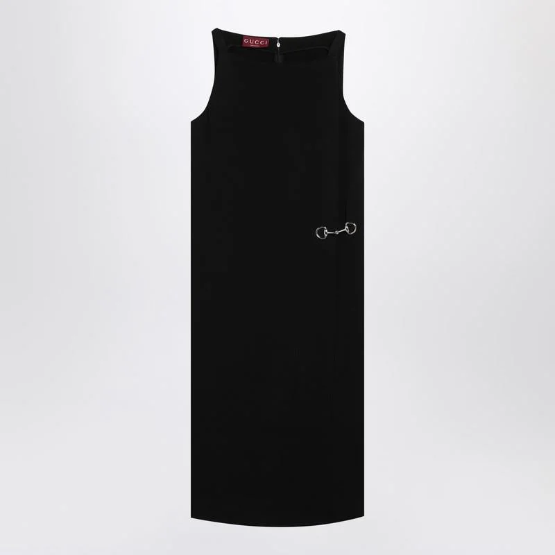 Black heavy viscose sable sleeveless dress from Gucci featuring a boat neckline, an unlined design, two side welt pockets, a horsebit detail and a concealed rear zip fastening. Gender: Women Material: Fabric I: 100% Viscose / Pocket lining: 75% Acetate - 25% Silk Color: Black Made in: Italy Product ID: 808796ZAR2L/Q_GUC-1000 *Import tax/duty will be calculated at checkout (If applicable)