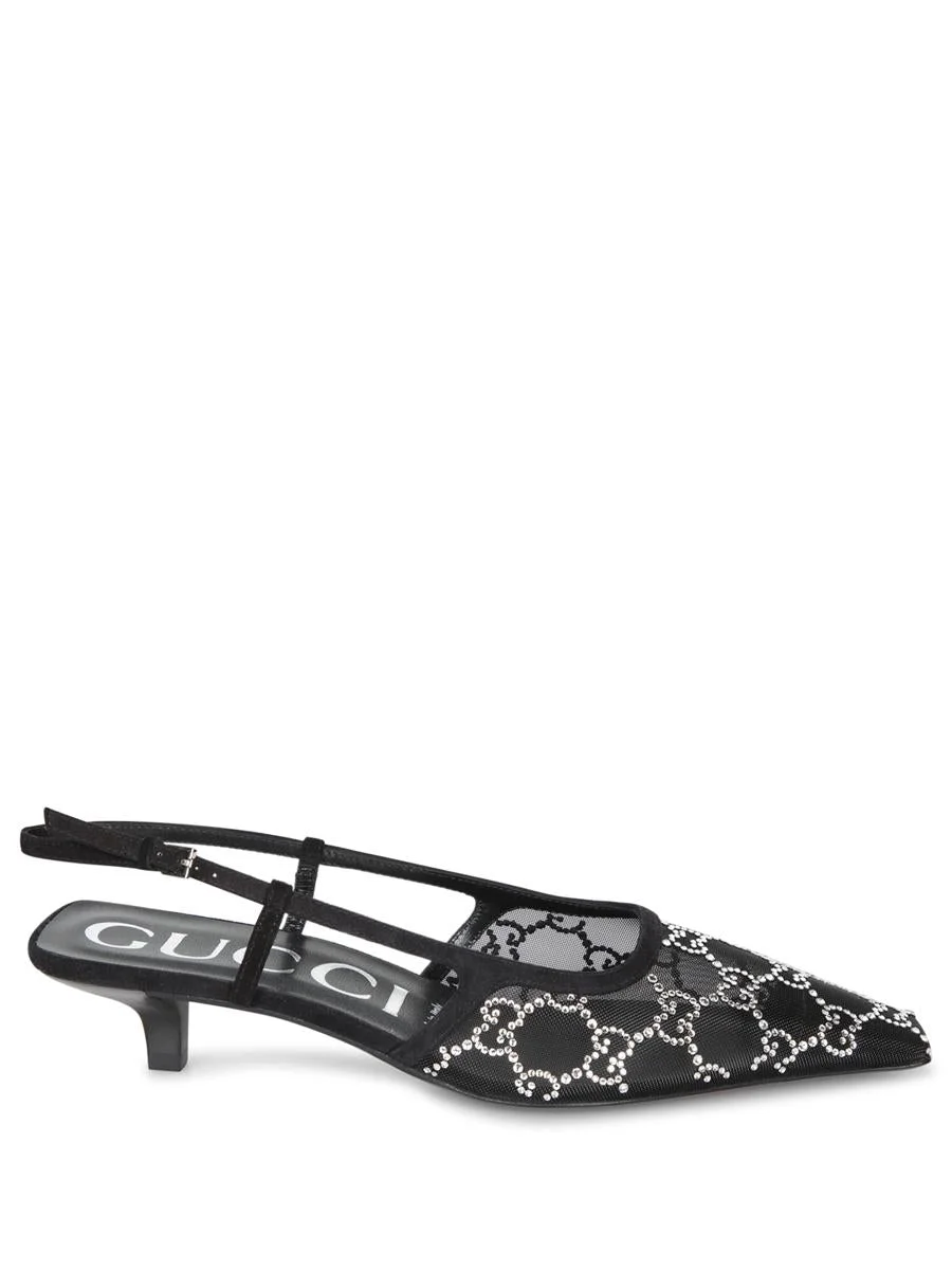 Leather dAcolletA by Gucci. Crystal GG black mesh. Suede leather details. Leather sole. Buckle fastening to the rear. Heel height: 3.5 cm Gender: Women Material: 100% CALF LEATHER Color: Black Made in: Imported Product ID: 675829 F13A0 1000 *Import tax/duty will be calculated at checkout (If applicable)