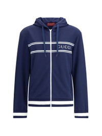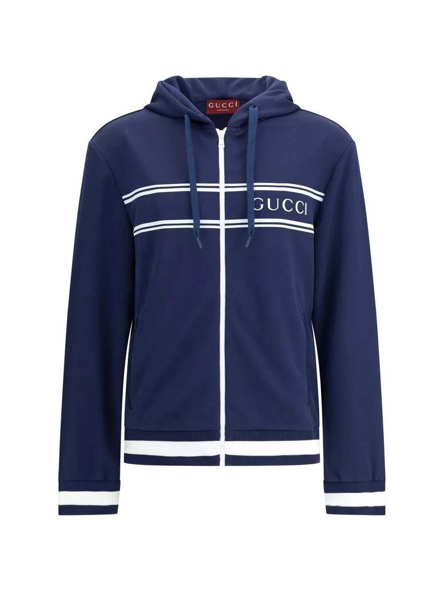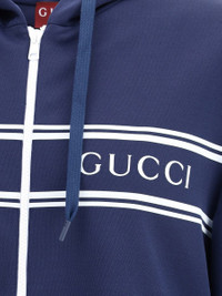 GUCCI'S JERSEY HOODIE COMBINES COMFORT AND SPORTY STYLE WITH THE HOUSE'S ICONIC DETAILS. DECORATED WITH A STRIPED PRINT AND THE GUCCI LOGO, IT FEATURES A FIXED HOOD WITH DRAWSTRING, LONG SLEEVES AND TWO SIDE POCKETS. STRIPED RIBBED TRIM COMPLETES THE DESIGN WITH A DISTINCTIVE TOUCH. STANDARD Gender: Men Material: POLYESTER Color: BLUE Made in: Italy Product ID: 787939XJGJ5_1010 *Import tax/duty will be calculated at checkout (If applicable)
