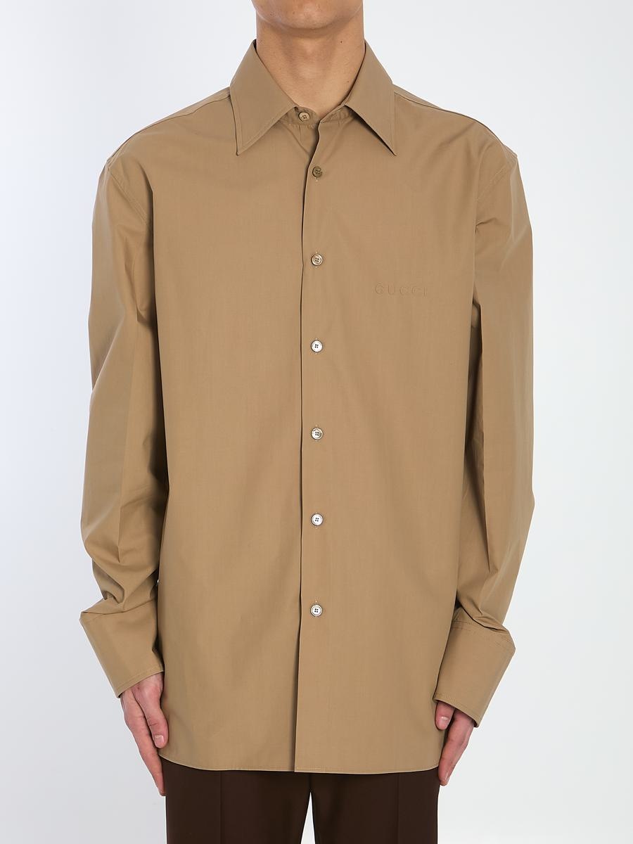 Beige cotton poplin shirt. It features a pointed collar, button closure, an embossed Gucci logo on the chest, and buttoned cuffs. Oversized fit. The model is 187cm tall and wears a size IT 50. Size nationality: IT Gender: Men Material: 100% COTTON; DETAIL: SILICONE Color: Beige Made in: IT Product ID: 35460699 823830 Z7AMD 2319 *Import tax/duty will be calculated at checkout (If applicable)