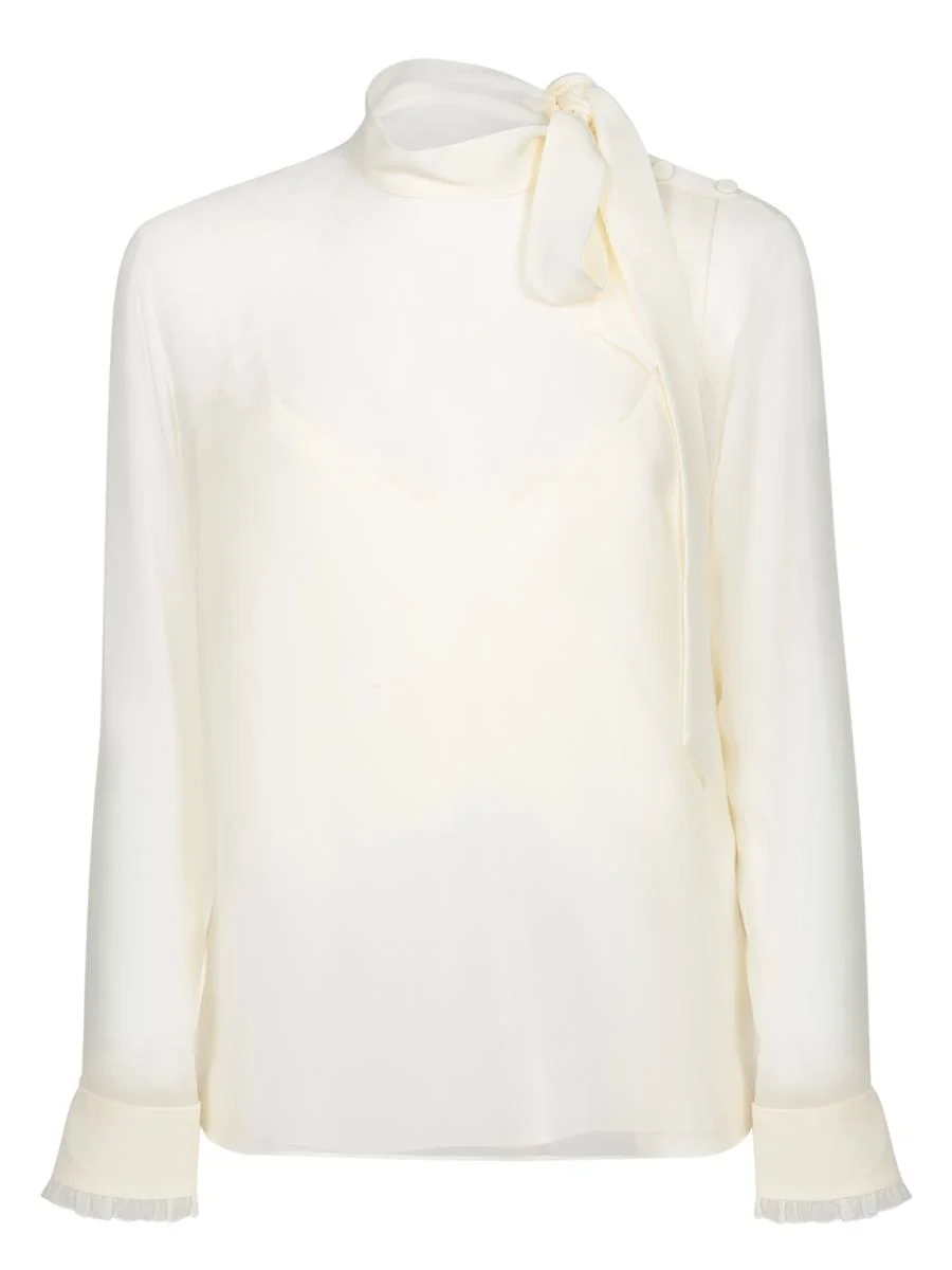 Long sleeves, side tie at the neckline, button closure on the cuffs.. Elegant Gucci pure white silk blouse, featuring a delicate side tie adding a sophisticated touch. Precise finishing with buttons on the cuffs for a clean look Gender: Women Material: SILK Color: WHITE Made in: Imported Product ID: 808280 ZHS04 9205 *Import tax/duty will be calculated at checkout (If applicable)