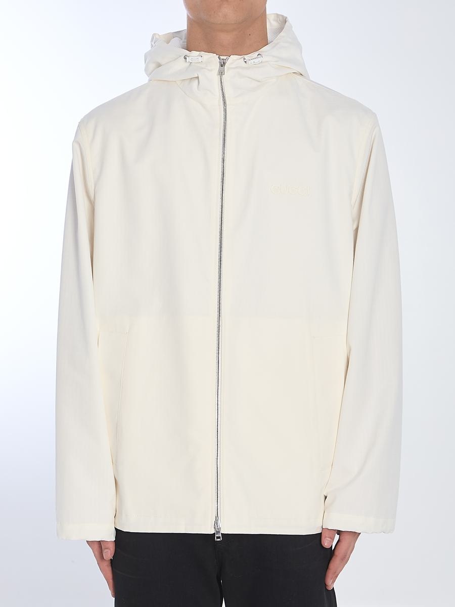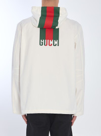 Hooded jacket in textured white cotton. It features a drawstring hood with a green and red Web detail and a Gucci logo extending across the back, a front zip closure, a tone-on-tone Gucci logo applique on the chest, two side pockets, and adjustable drawstrings at the cuffs and hem. The model is 189cm tall and wears a size IT 48. Size nationality: IT Gender: Men Material: 100% COTTON; DETAILS: POLYURETHANE, POLYAMIDE, ELASTANE, POLYESTER Color: WHITE Made in: IT Product ID: 2289550 804962 ZAIAK 9174 *Import tax/duty will be calculated at checkout (If applicable)